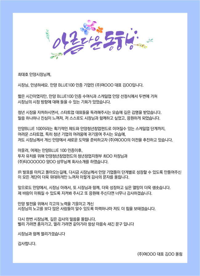 안양시가 추진하고 있는 청년창업과 기업지원에 진심으로 감사하다는 내용