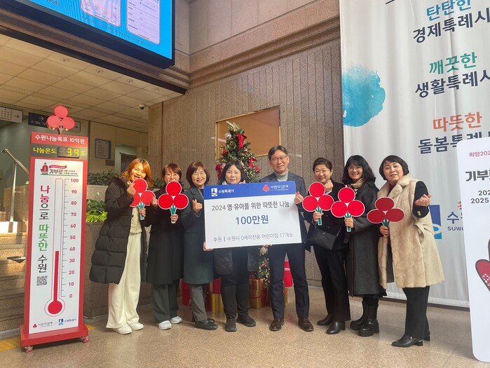 수원시는 경기사회복지공동모금회 지정기탁 방식으로 성금을 취약계층 아동 가정에 전달할 예정이다. 성금 전달식은 24일 시청 로비에 설치된 사랑의 온도탑 앞에서 열렸다.