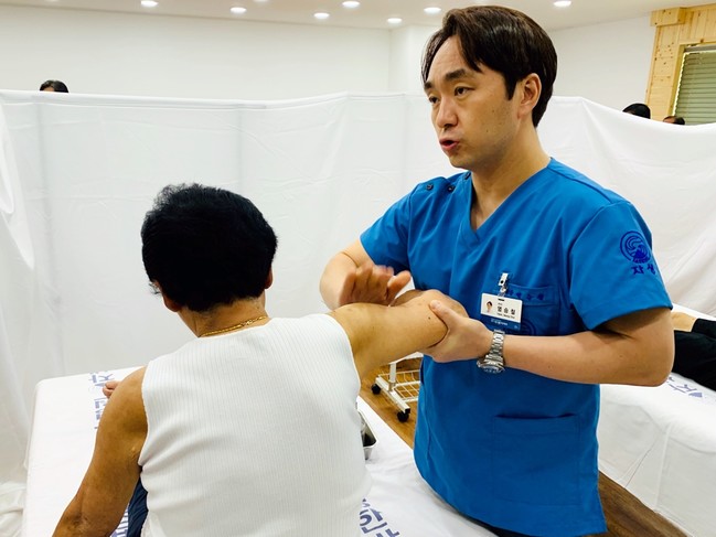 <사진/ 광주자생한방병원 염승철 병원장이 진료소에 방문한 환자를 치료하고 있다>