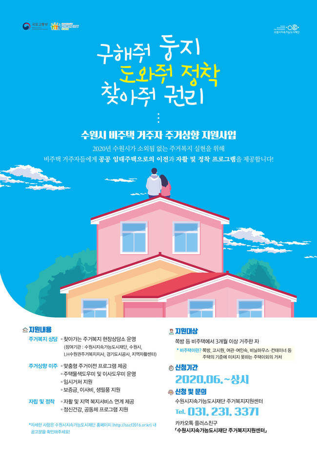 [로컬라이프] 수원시지속가능도시재단이 쪽방·고시원과 같은 ‘비주택’에 거주하는 시민이 공공임대주택으로 이주할 수 있도록 지원하는 ‘2020년 수원시 비주택 거주자 주거 상향 지원사업’을 전개한다.