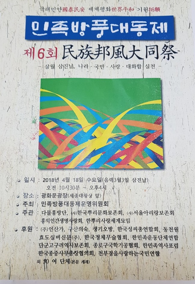 ‘2018 제6회 민족방풍대동제’가 오는 4월 18일 음력 3월3일 삼진날을 기해 서울 광화문 세종대왕 동상 앞에서 개최된다.