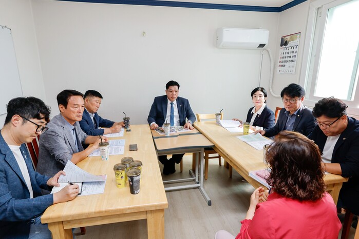 사진/화성특례시의회 도시건설위원회 위원들이 복지시설을 방문해 기관현황을 청취하고 있다.(사진제공=화성시의회)
