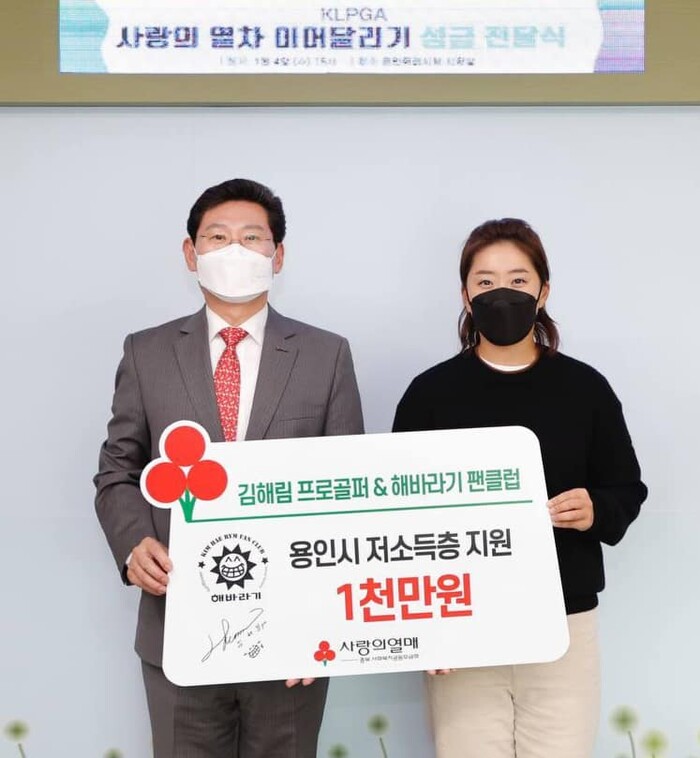 아울러 저는 감사의 뜻을 전하면서 용인 시민들의 큰 사랑을 받고 있는 용인특례시 캐릭터 '조아용'을 선물했다. 김해림 선수와 팬클럽이 낸 성금은 김 선수의 버디 1개가 나올 때마다 김 선수가 1000원을 적립하고, 200여명의 팬클럽 회원들이 십시일반 모은 것이라고 한다며, 성금은 사회복지공동모금회를 통해 용인의 취약계층을 지원하는데 쓰인다고 전했다.