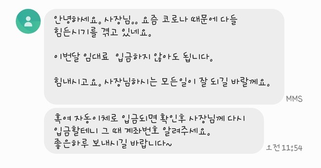 신씨는 “요즘 코로나 사태로 매출이 평소의 10%가 겨우 될까말까 한데 임대인으로부터 이런 문자를 받아 울컥했다”면서 “임대료 감면은 둘째치고 마음에 큰 위로가 됐다”고 말했다.