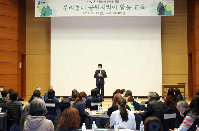 이어 이득현 수원그린트러스트 이사장이 ‘도시공원과 시민참여’를 주제로 서울 성동구 서울숲공원, 경기 수원시 영통구 광교호수공원 사례를 분석해 각 시민 봉사자 역량을 강화하는 교육을 진행했다.