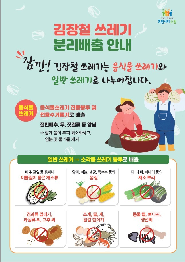 수원시가 제작한 ‘김장철 쓰레기 분리배출 안내’ 홍보물은 김장철 쓰레기 중 음식물 쓰레기와 일반쓰레기를 상세하게 구분해 설명한다.