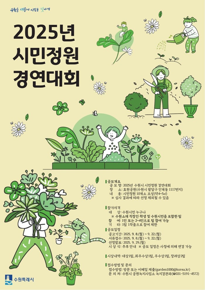 수원시(시장 이재준)는 9월 22일까지 ‘2025년 시민정원 경연대회’에 참가할 시민을 모집한다.