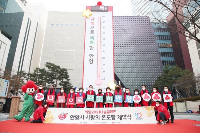 안양시는 연말연시 기부문화 활성화를 위한‘희망2021 나눔캠페인’사랑의 온도탑 제막식이 11일 안양 범계역 광장에서 열렸다고 밝혔다.