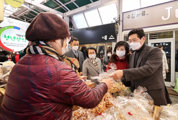 이상일 용인특례시장은 18일 민족대명절인 설을 앞두고 처인구 김량장동 용인중앙시장을 찾아 직접 장을 보며 전통시장 상인들을 격려하고, 시장을 찾은 시민들에게 설 인사를 했다.