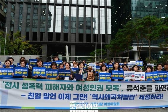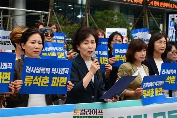 한편, 이날 집회에서 권영희 민주당 서울시당 여성위원장(서울시의회 기획경제위원회 부위원장·비례대표)은 “우리 역사를 왜곡하고 민족을 조롱하는 자들의 망언을 결코 간과해서는 안 되며 올바른 역사인식과 인권의식이 우리 사회에 뿌리 내릴 수 있도록 깨어있는 시민의 조직된 힘을 보여줘야 한다”며 “류석춘과 같은 망언자들이 강단, 의회 등 공적인 자리에서 함부로 망발하지 못하도록 하는 제도 마련이 절실하며 국회는 역사 왜곡과 훼손을 방지할 수 있는 역사왜곡처벌법을 마련해야 한다”고 강조했다.