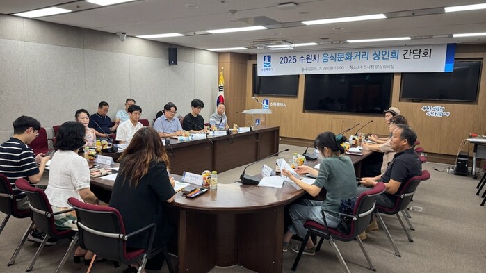 수원시(시장 이재준)가 28일 시청 영상회의실에서 ‘음식문화거리 상인회 간담회’를 열고, 음식문화거리 활성화 방안을 논의했다.