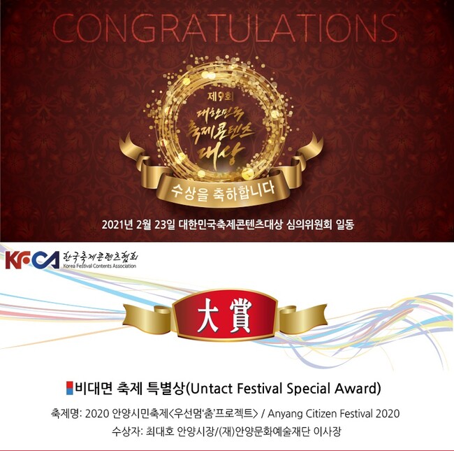 안양시와 안양시민축제추진위원회가 주최하고 안양문화예술재단이 주관한 2020 안양시민축제 <우선멈‘춤’프로젝트>가 (사)한국축제콘텐츠협회에서 주최하는 「2021 제9회 대한민국축제콘텐츠대상」축제로 선정되었다.