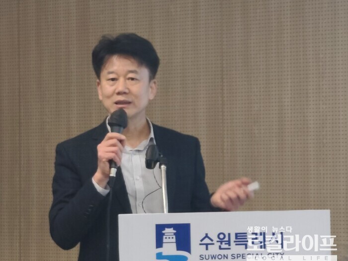 | ▲ 김종석 수원시 도시정책실장이 영통지구 종합의료시설부지 사전협상 결과를 설명하고 있다. (사진촬영=송준형 기자) |