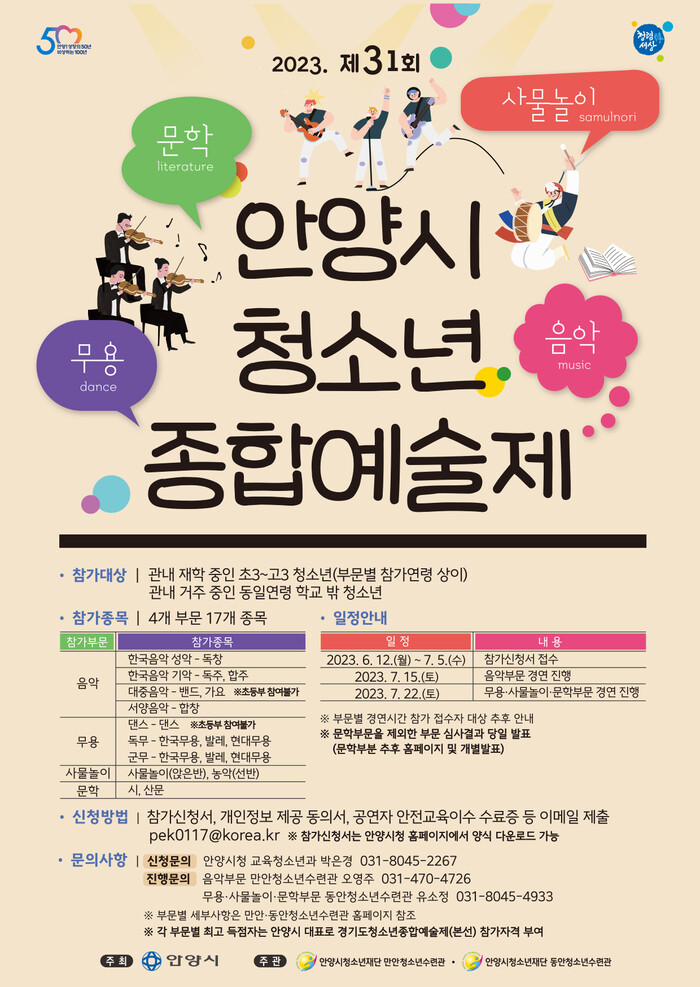 제31회 안양시 청소년종합예술제는 관내 초(3학년 이상)·중·고등학생 및 학교밖 청소년이 음악, 무용, 사물놀이, 문학 등 4개 부문의 총 17개 종목을 경연하는 축제이다.