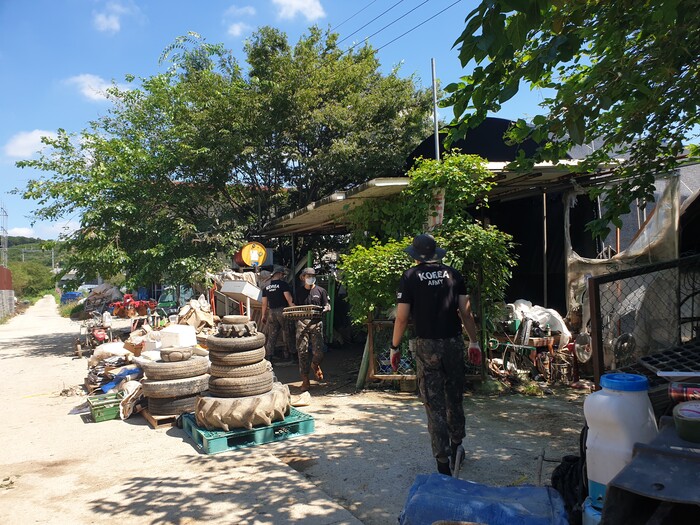 연일 지속된 폭우로 주택과 농가, 하천할 것 없이 침수피해를 입은 가운데, 군 장병들이 나서서 피해복구에 팔을 걷어붙여 주위에 훈훈한 감동을 주고 있다.
