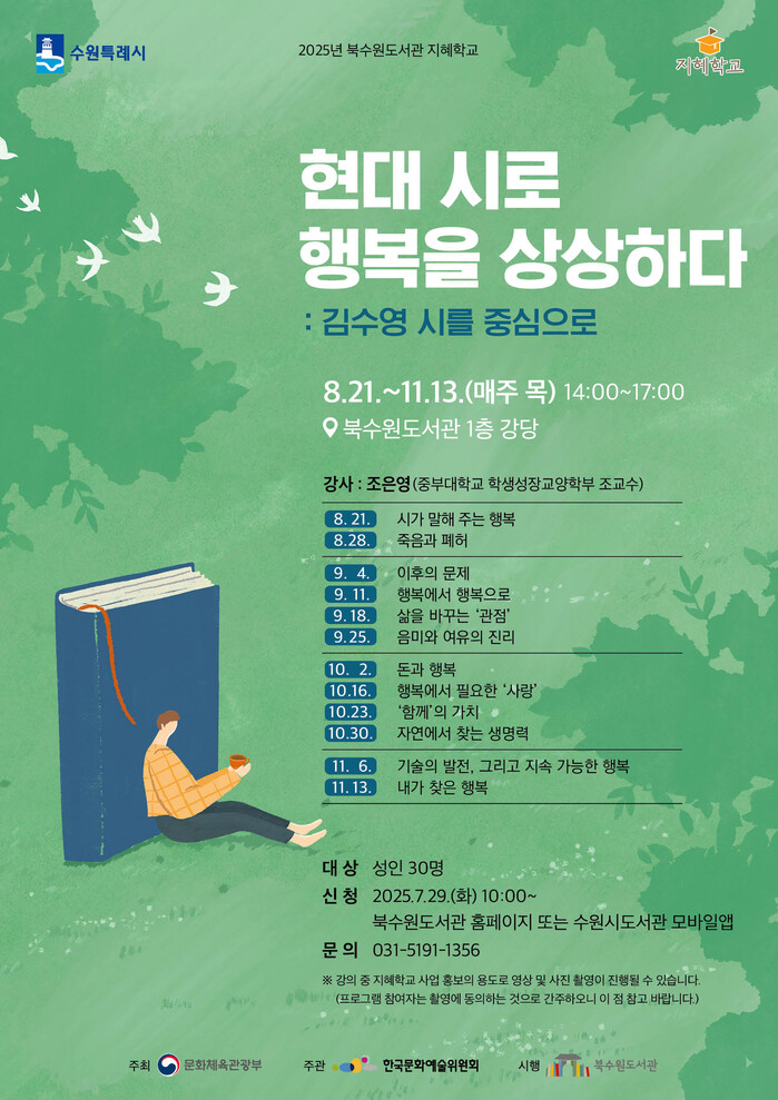 ‘현대 시로 행복을 상상하다’ 북수원도서관 지혜학교 강의다. 김수영의 시를 중심으로 ‘행복’의 의미를 재구성하고 삶을 성찰하는 시 기반 인문 프로그램이다. 8월 21일부터 11월 13일까지 매주 목요일 오후 2시부터 세 시간 동안 북수원도서관 강당에서 진행한다. 조은영 중부대학교 학생성장교양학부 조교수가 강사로 나선다. 성인 30명을 대상으로 한다.