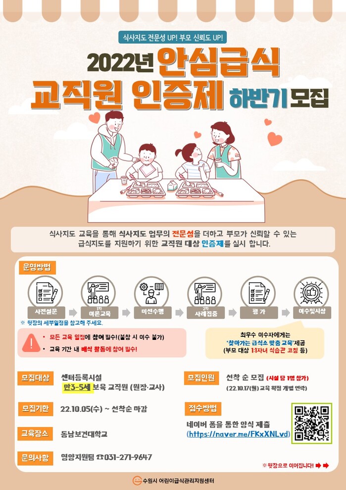 수원시어린이급식관리지원센터가 ‘2022년 안심급식인증제’ 하반기 과정에 참여할 만3-5세 보육기관 교직원을 선착순으로 모집한다.