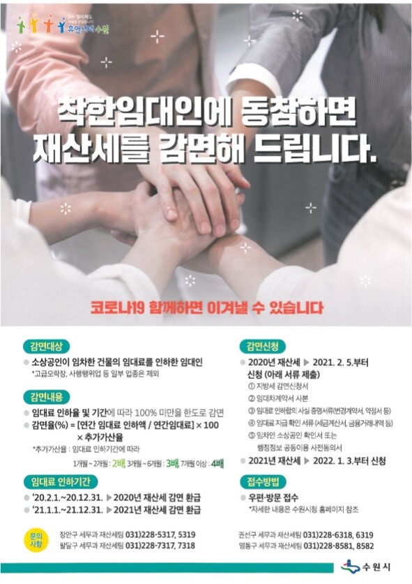 착한임대인에 대한 재산세 감면은 실제임대료 인하액과 인하기간에 따라결정되며 2020년 임대료 인하분에 대해서는 2021년 2월 5일부터, 2021년 임대료 인하분에 대해서는 2022년 1월부터 팔달구청 세무과로 신청하면 2020년과 2021년 재산세를 환급하는 방식으로 지원한다.