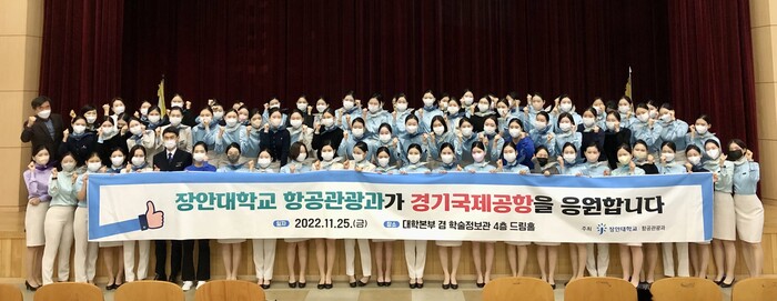 경기국제공항화성유치위원회는 25일 장안대학교 학술정보관 드림홀에서 항공관광과 학생 150여명과 함께 경기국제공항 건설의 필요성에 대한 설명회를 진행하고, 경기국제공항 유치를 기원하는 대형 현수막 퍼포먼스를 선보였다.