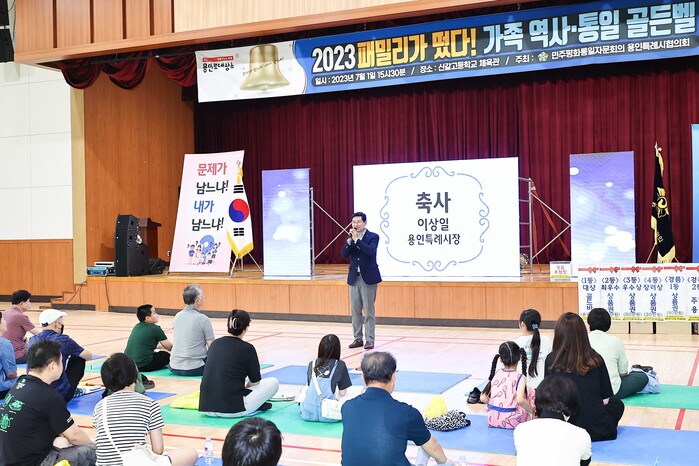 이상일 용인특례시장이 1일 기흥구 신갈고등학교 체육관에서 열린 ‘2023 패밀리가 떴다! 용인 가족 역사·통일 골든벨대회’에 참여해 관계자와 시민들을 격려했다.