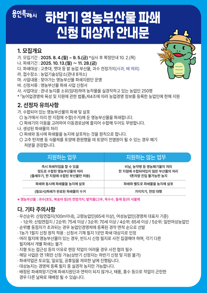 용인특례시(시장 이상일)는 용인시농업기술센터에서 미세먼지 저감, 산불 예방, 병해충 발생 최소화를 위해 ‘2025년 하반기 영농부산물 안전처리 지원 사업’ 신청자를 모집한다고 29일 밝혔다.