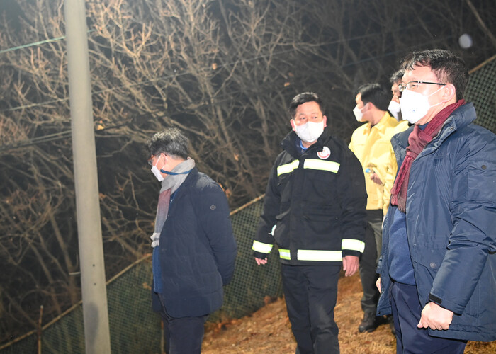 사진/조청식 수원시장 권한대행이 산불발생 지역 주변에서 진화상황을 점검하고 있다.(사진제공=수원시)