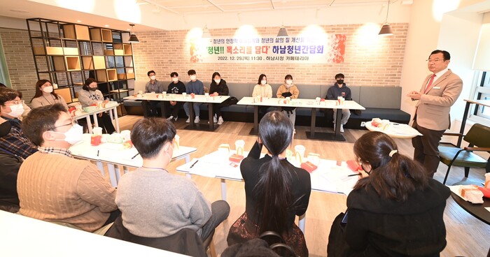 사진/이현재 시장이 지난해 12월 29일 열린 하남청년간담회에서 청년들의 고민과 청년정책에 대해 의견을 나누고 있다.(사진제공=하남시)
