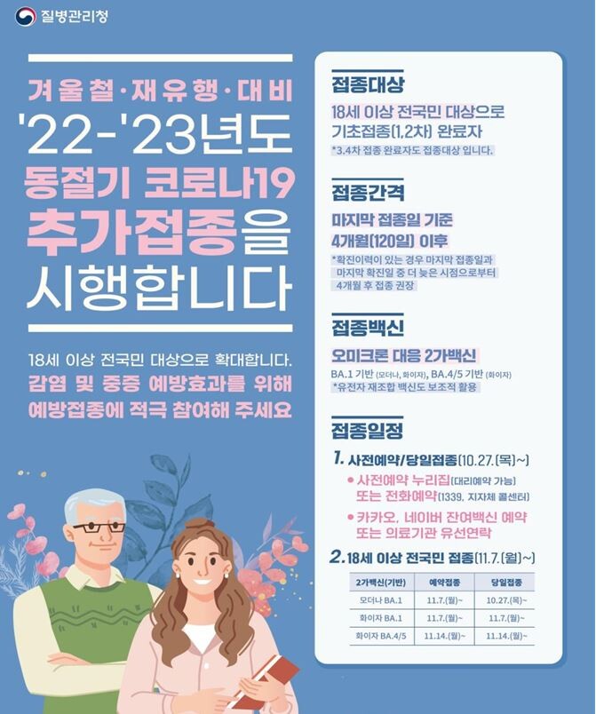 사전예약은 10월 27일부터 누리집(https://ncvr.kdca.go.kr) 또는 전화(1339) 예약을 하고, 잔여백신을 통한 당일접종은 SNS(네이버, 카카오톡) 당일예약 및 가까운 접종 위탁의료기관에 유선 예약이 가능하다.