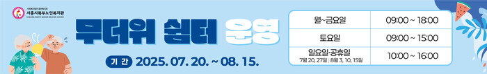 이병우 시흥시북부노인복지관장은 “폭염에 특히 취약한 어르신들이 건강하게 여름을 나실 수 있도록 일요일과 공휴일에도 복지관을 개방해 쉼터를 운영하게 됐다”라며 “폭염에 대비한 선제적 보호조치로 어르신들의 안전 확보에 최선을 다하겠다”라고 말했다.