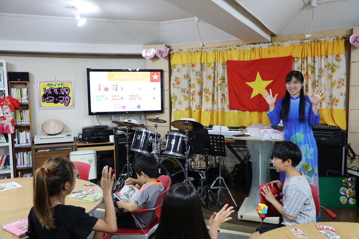 사진/2일 수원시 매탄동 작은도서관에서 아이들이 베트남 문화를 배우고 있다.(사진제공=수원시)