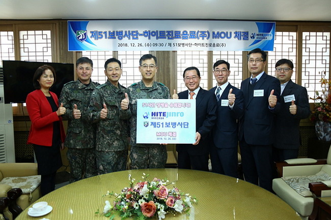 이번 협약에 따라 하이트진로음료는 자연재해 피해 복구, 농번기 일손 돕기 등 51사단이 지역민들을 위해 펼치는 대민 활동에 먹는 샘물 ‘석수’를 비롯한 자사 제품을 지원하고, 견학, 교육 등 51사단 장병의 사회 진출에 필요한 정보를 제공하기로 했다.