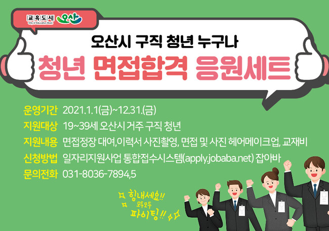 [로컬라이프] 오산시(시장 곽상욱)는 지난해 시범운영했던 ‘청년 면접합격응원세트’사업을 올해는 대상인원과 예산을 확대하여 지속 추진한다고 밝혔다.