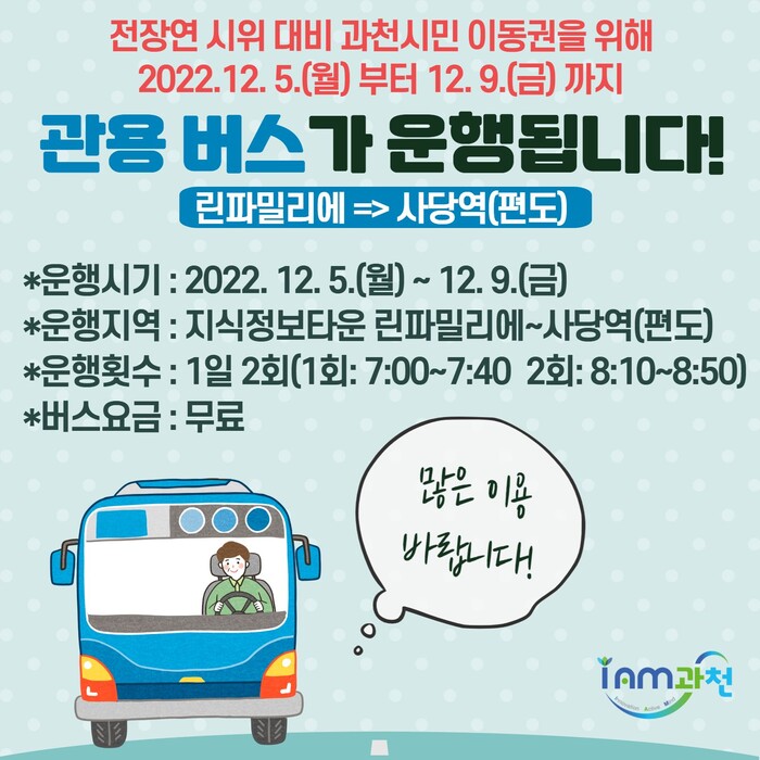 [로컬라이프] 송준형 기자 = 신계용 과천시장은 5일, 자신의 페이스북을 통해 과천시는 전국장애인차별철폐연대의 시위로 인한 시민 여러분의 불편을 덜고자 과천시 관용버스를 아래와 같이 운행한다며, 참고하시기 바란다고 전했다.