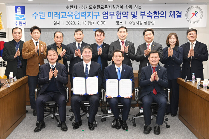 13일 시청 상황실에서 열린 협약식에서 이재준 수원시장과 경기도교육감의 권한을 위임받은 황윤규 경기도수원교육지원청 교육장은 협약서에 서명하고 협력을 약속했다. 협약에 따라 두 기관은 2023년 수원미래교육협력지구 세부 사업의 원활한 추진을 위해 적극적으로 협력하기로 했다.