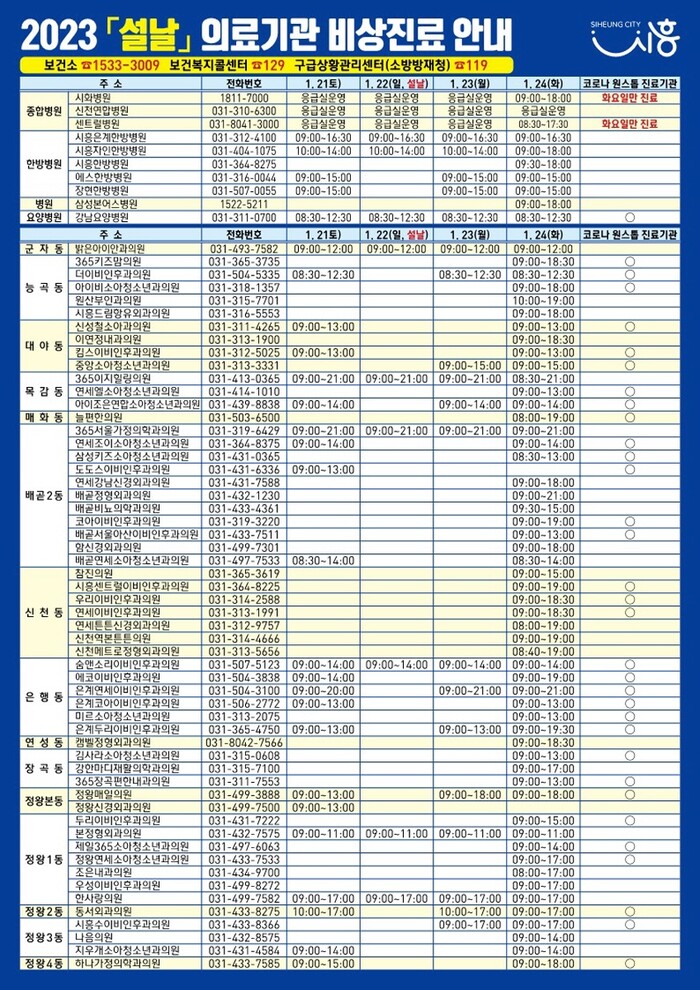명절 연휴기간 중 비상 진료에 대한 내용과 인근 지역 당직의료기관 및 휴일지킴이 약국 연락처 등의 정보는 응급의료정보센터 누리집, 시흥시 누리집과 스마트폰 앱 ‘응급의료정보제공’을 통해 검색할 수 있다. 또한, 시흥시보건소(031-310-5824), 보건복지콜센터(129), 119구급상황관리센터, 120 시도 콜센터를 통해서도 안내받을 수 있다.