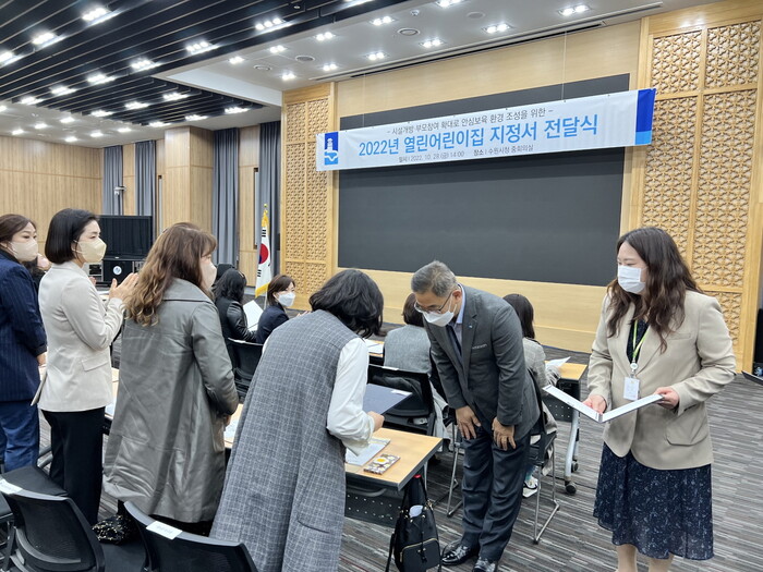수원시가 28일 시청 중회의실에서 ‘2022년 수원시 열린어린이집’으로 선정된 관내 어린이집에 지정서를 전달했다.