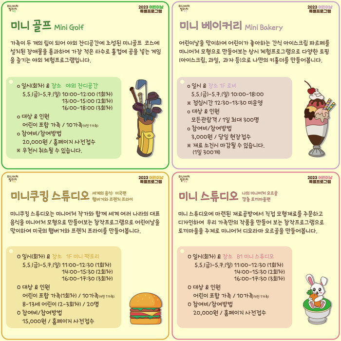 어린이날 프로그램에 대한 정보는 오산미니어처빌리지 홈페이지와 SNS(인스타그램, 페이스북)를 통해 확인할 수 있으며, 오는 26일 오전 10시부터 홈페이지에서 신청할 수 있다.