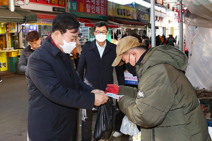 김성제 의왕시장은 이날 관내 유일한 전통시장인 부곡도깨비시장을 찾아 의왕사랑상품권과 온누리상품권을 사용해 생활용품, 제수용품 등을 구매하며 상인들의 애로사항을 청취하고, 장보기에 나선 시민들과 새해 인사를 나눴다.