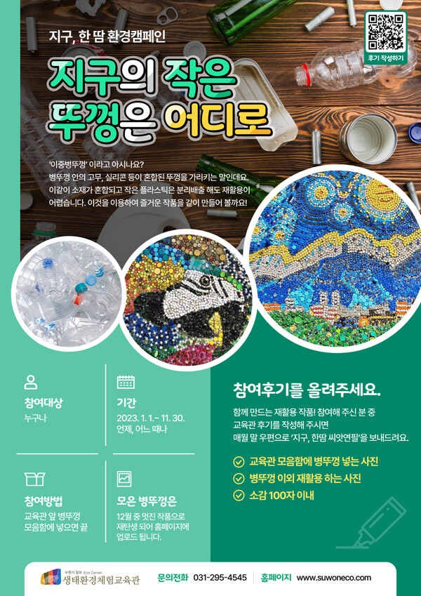 수원시 칠보 생태환경체험교육관은 올해 연중 환경캠페인으로 ‘지구, 한땀-지구의 작은 뚜껑은 어디로’를 진행한다.