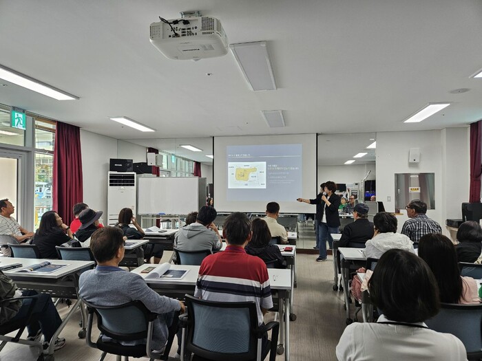 사진/2024마을만들기협의회 워크숍 참석자들이 뉴딜사업의 상징인 유성구 안녕마을 김효임 이사장의 강의를 듣고 있다.(사진제공=수원시)