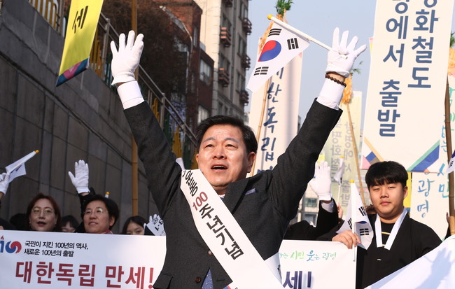 사진/ 광명사거리역에서 광명시민회관까지 3.1운동 100주년 기념 만세삼창 거리 행진을 진행했다. 박승원 광명시장이 만세를 선창하고 있다.