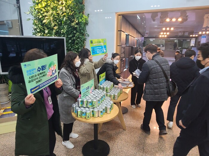 수원시 마을자치과가 주관한 캠페인은 출근하는 직원과 종합민원실에 방문한 시민들에게 공정무역 원두로 만든 캔커피와 ‘공정무역 초콜릿&교육 키트’, 공정무역 마크가 새겨진 KF94 마스크를 나눠주며 공정무역을 알리는 방식으로 진행됐다.
