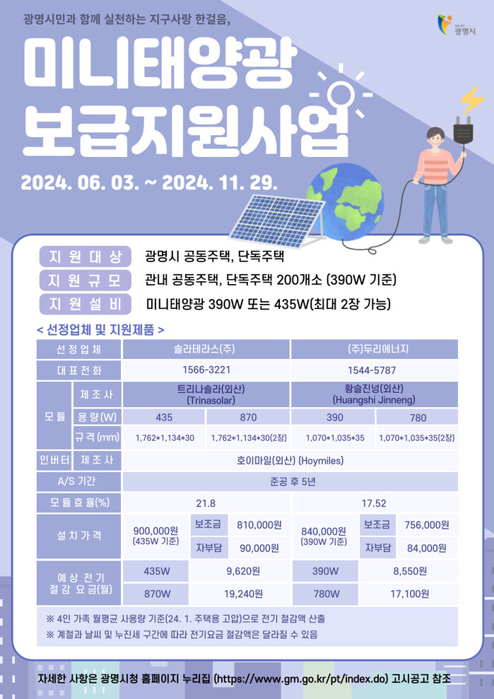 자세한 사항은 광명시청 누리집(gm.go.kr) 공고란을 참고하거나, 시공사인 솔라테라스(1566-3221), 두리에너지(1544-5787)에 문의하면 된다.