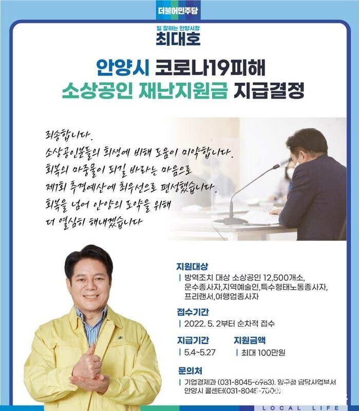 이어 “시의회의 적극적인 이해와 도움으로 2021년 8월 1일 이후 사회적거리두기 방역조치로 집합금지,영업시간제한을 적용받은 안양시 1만 2500여개 업소에 각 100만 원을 지급할 예정이다”라며 “운수종사자, 지역예술인, 여행업체여행업 종사자, 특수형태 노동종사자,프리랜서 등 최대 100만원까지 지원받을 수 있다”고 밝혔다.