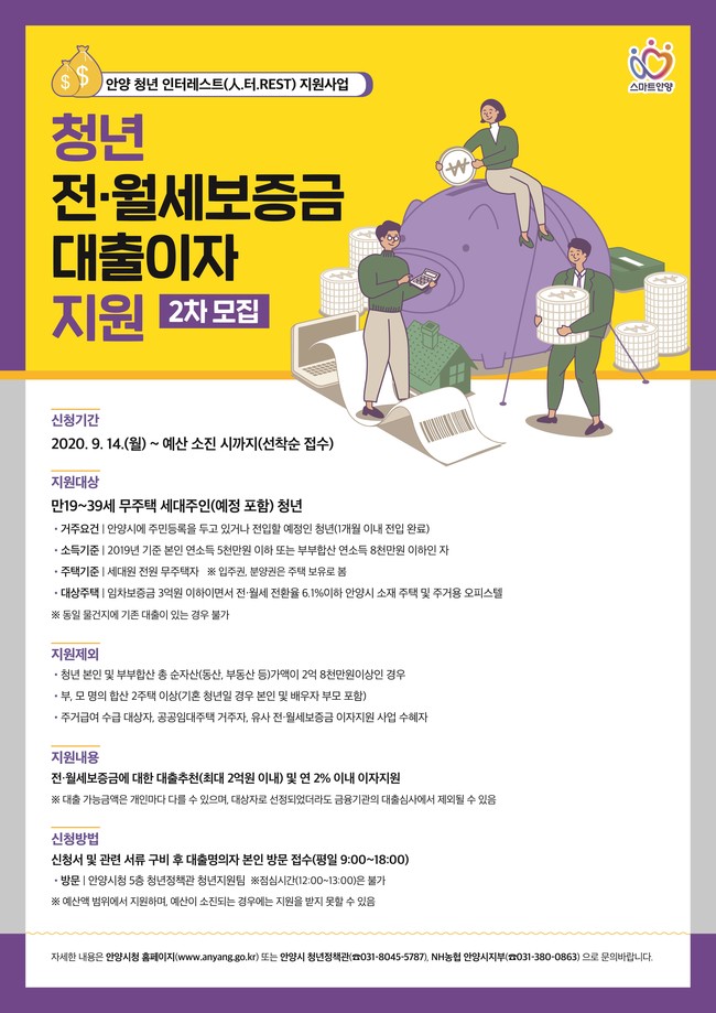 청년도시 안양시가 청년들에게 전.월세보증금 대출 추천 및 이자지원을 위해 오는 14일부터 ‘안양 청년 인터레스트(人.터.REST) 지원 사업’의 2차 지원 대상자를 모집한다고 2일 밝혔다.