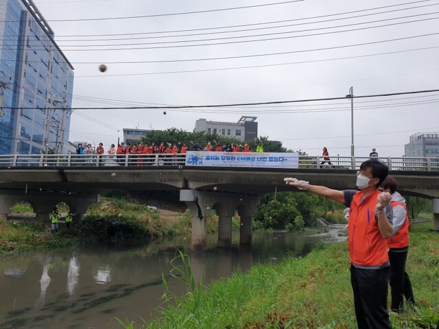 EM흙공이란 유용 미생물을 담은 EM용액과 황토를 배합해 만든 것으로, 하천의 유기물을 분해하고 수질정화 및 악취제거에 효과가 있는 것으로 알려져 있으며, 하천변 환경 민원을 해소할 것으로 기대되고 있다.
