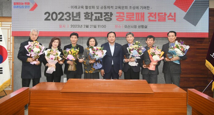 오산시(시장 이권재)는 21일 시청 상황실에서 미래교육 활성화 및 공동체적 교육문화 조성에 기여하고 교직 생활을 마무리하는 관내 학교장을 대상으로 공로패를 전달했다고 밝혔다.