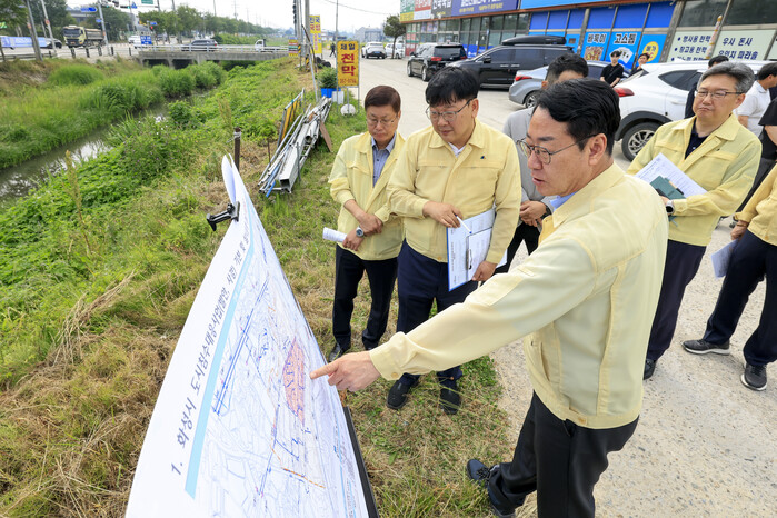 정 시장은 이날 안전건설국장, 하수과장, 송산면장 등 관계 공무원과 함께 간이배수펌프장 및 침수 대응시설 전반을 살펴보고, 사강지구와 발안지구 도시침수 대응사업의 추진계획을 보고받았다.