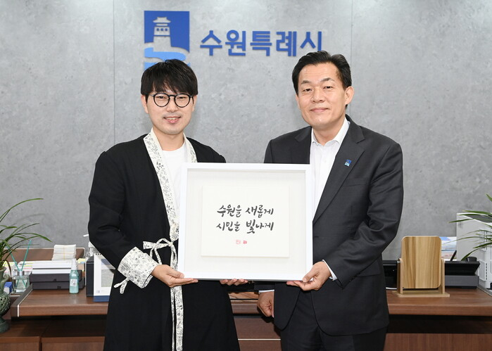 ‘수원을 새롭게 시민을 빛나게’ VI(vision identity, 시정브랜드) 켈리그래피를 제작한 김상훈(38) 작가는 2일 수원시청을 방문해 이재준 수원특례시장에게 켈리그래피를 전달했다. 켈리그래피는 손글씨로 구현하는 시각 예술을 말한다.