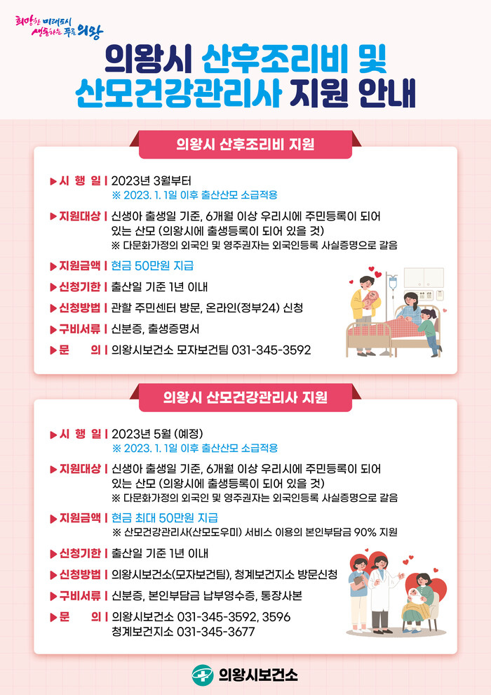 ‘의왕시 산후조리비 및 산모건강관리사 지원 사업’관련 자세한 사항은 의왕시 보건소 홈페이지(공지사항)를 참고하거나 모자보건팀(☎ 345-3592)으로 문의하면 된다.